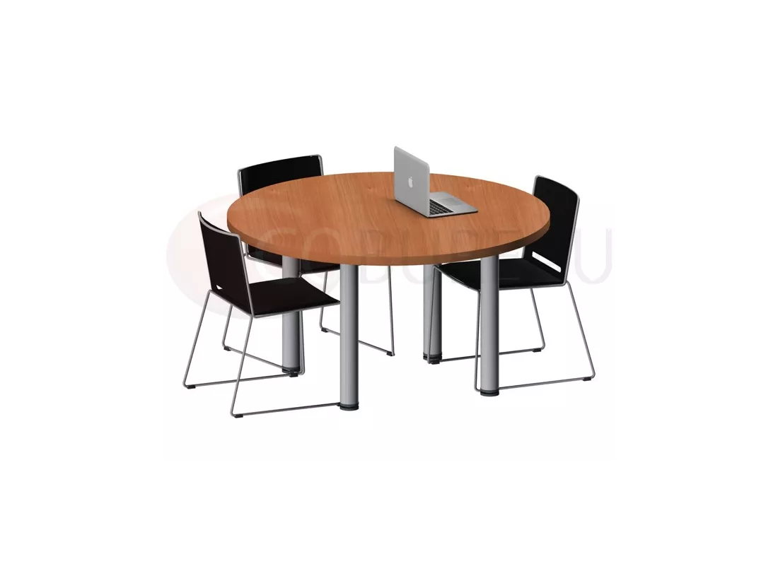 Plateau panneau de particules mélaminés antireflet épaisseur 30 mm; Chant droit ABS antichoc épaisseur 3 mm. 4 pieds tube métal finition aluminium. H 73 cm. Diamètre 120 cm : jusqu'à 6 personnes.