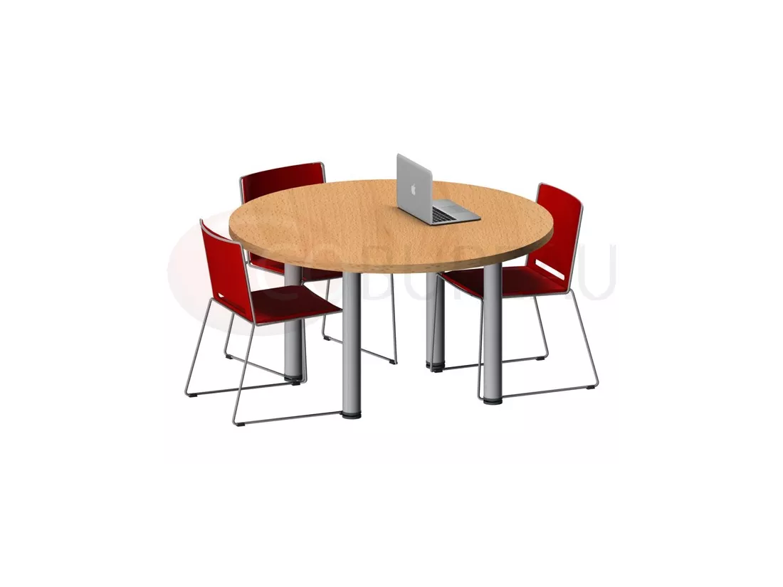 Plateau panneau de particules mélaminés antireflet épaisseur 30 mm; Chant droit ABS antichoc épaisseur 3 mm. 4 pieds tube métal finition aluminium. H 73 cm. Diamètre 120 cm : jusqu'à 6 personnes.