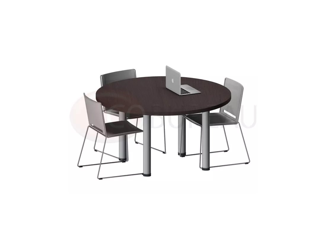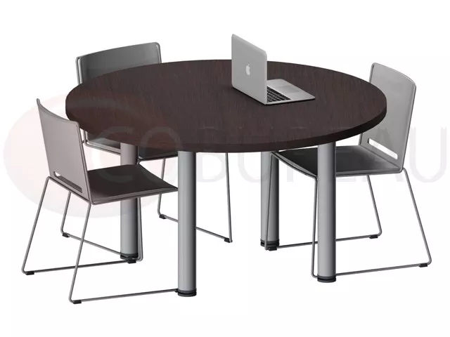 Plateau panneau de particules mélaminés antireflet épaisseur 30 mm; Chant droit ABS antichoc épaisseur 3 mm. 4 pieds tube métal finition aluminium. H 73 cm. Diamètre 120 cm : jusqu'à 6 personnes.