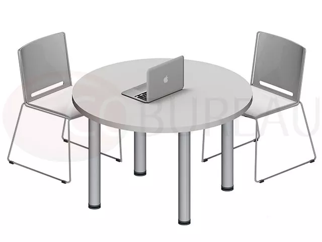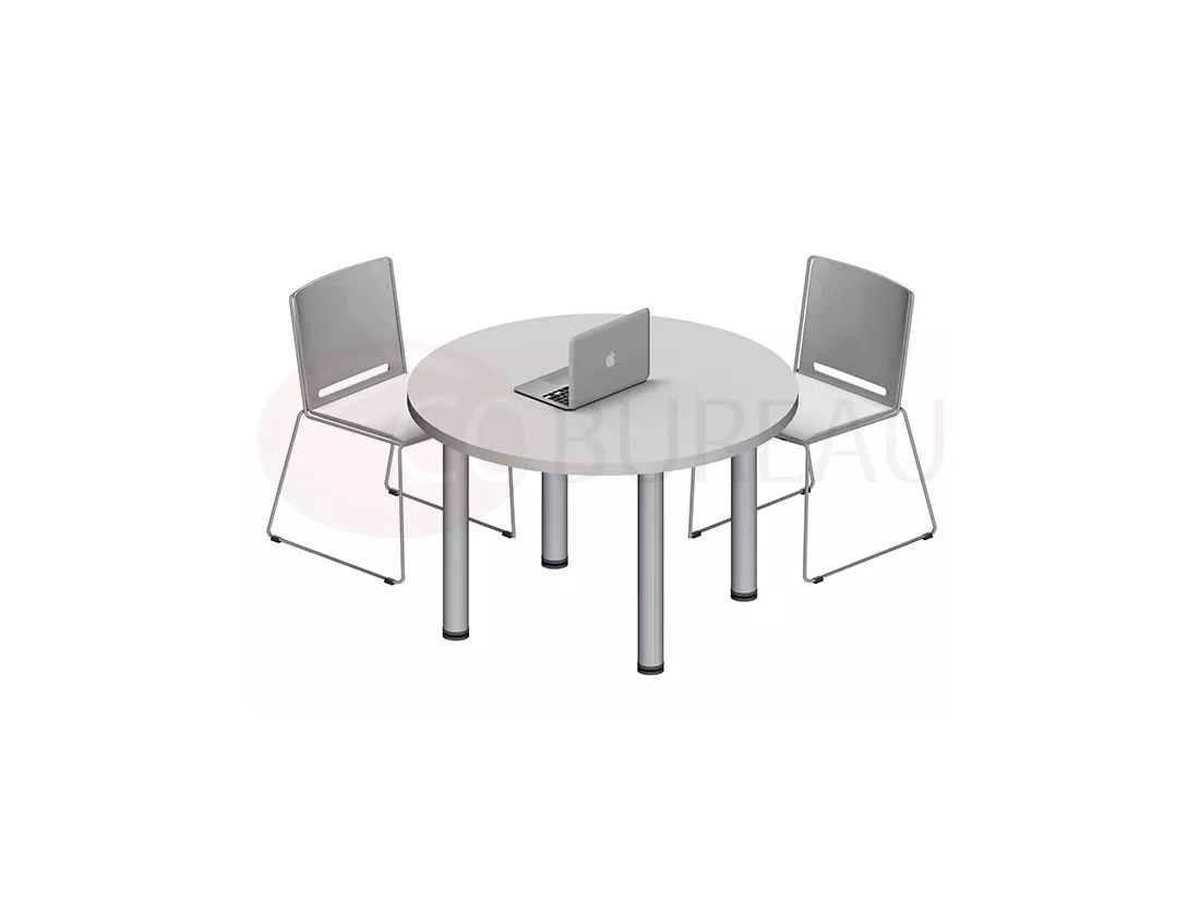 Plateau panneau de particules mélaminés antireflet épaisseur 30 mm; Chant droit ABS antichoc épaisseur 3 mm. 4 pieds tube métal finition aluminium. H 73 cm. Diamètre 100 cm : jusqu'à 5 personnes.