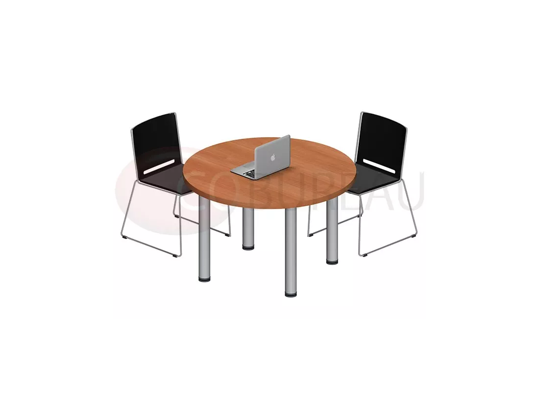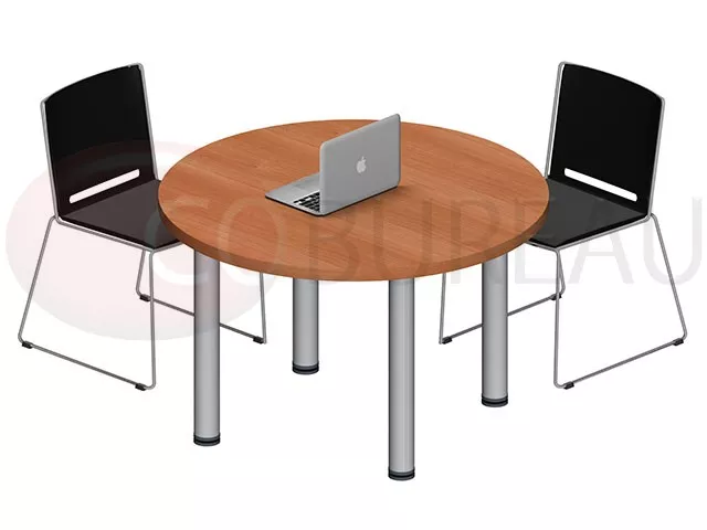 Plateau panneau de particules mélaminés antireflet épaisseur 30 mm; Chant droit ABS antichoc épaisseur 3 mm. 4 pieds tube métal finition aluminium. H 73 cm. Diamètre 100 cm : jusqu'à 5 personnes.