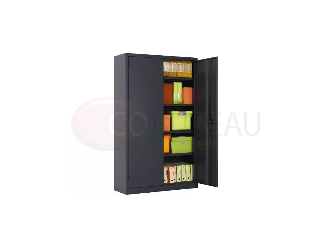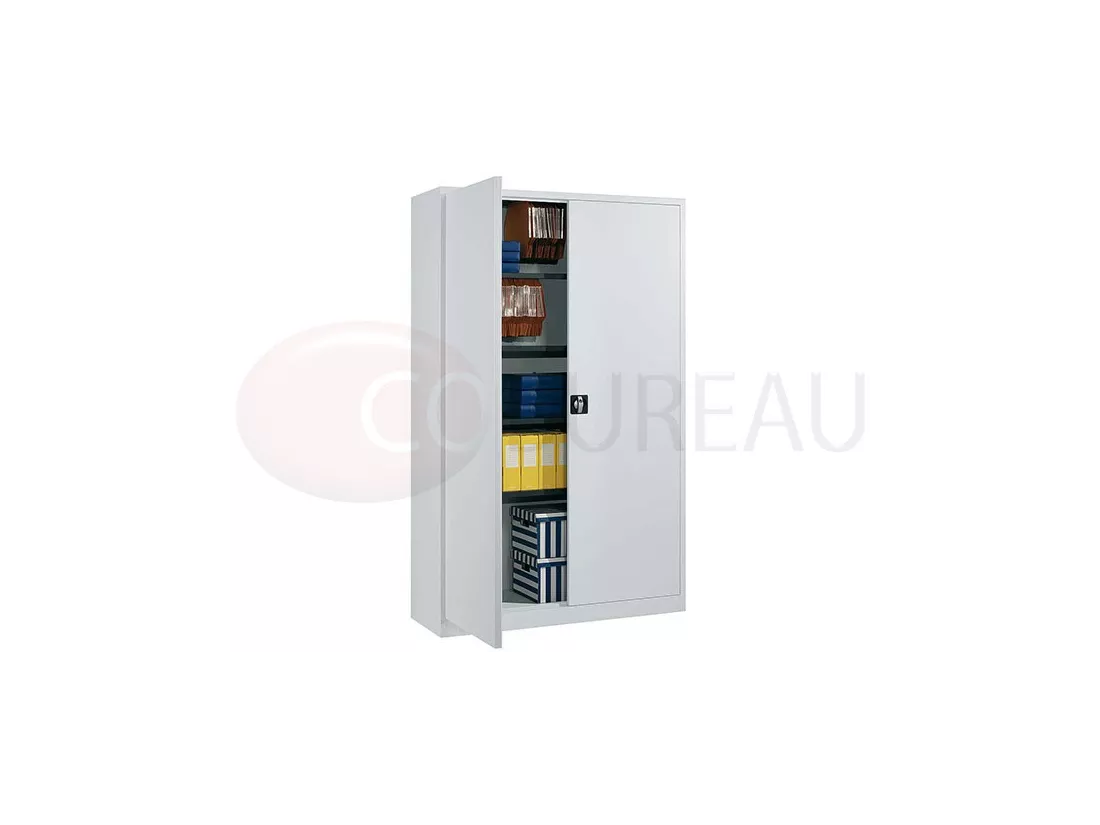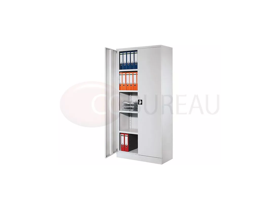 Armoire équipée de 4 tablettes métalliques réglables tous les 5 cm, profilées pour recevoir des dossiers suspendus.