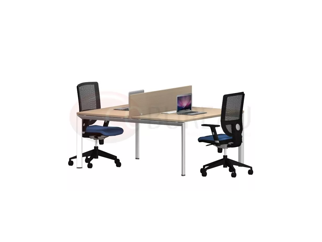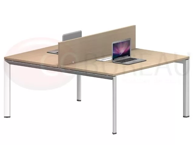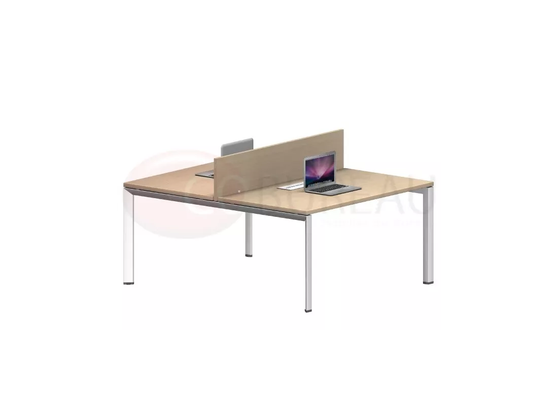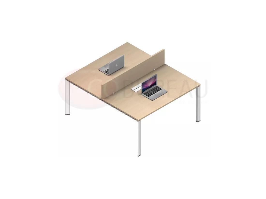 Bench de 2 bureaux 120 x 80 cm assemblés face à face, équipée de 2 Kits de connexion intégrés aux plateaux, cloisons de séparation en panneau de particules revêtement mélaminé antireflets, épaisseur 19 mm.