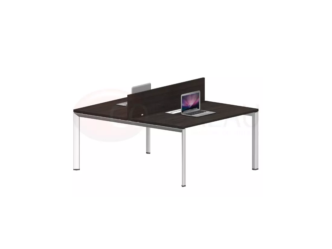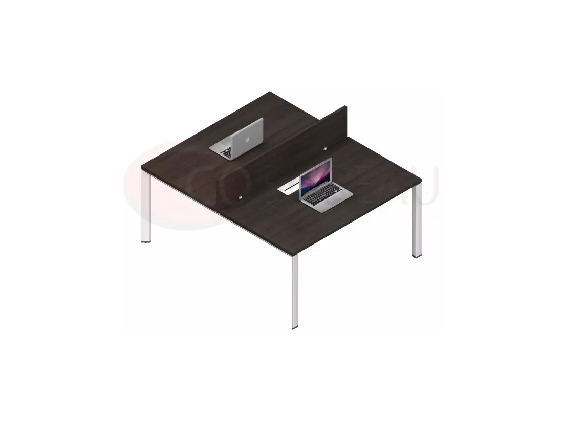 Bench de 2 bureaux 120 x 80 cm assemblés face à face, équipée de 2 Kits de connexion intégrés aux plateaux, cloisons de séparation en panneau de particules revêtement mélaminé antireflets, épaisseur 19 mm.
