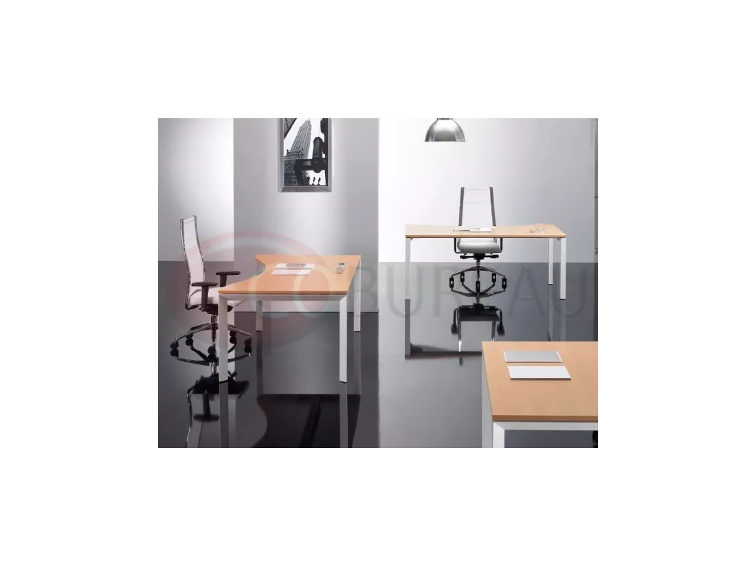 Surface de travail ergonomique. Intègre les espaces bureau, informatique et retour. Piétement " L" métal aluminium.