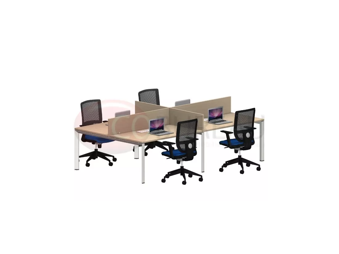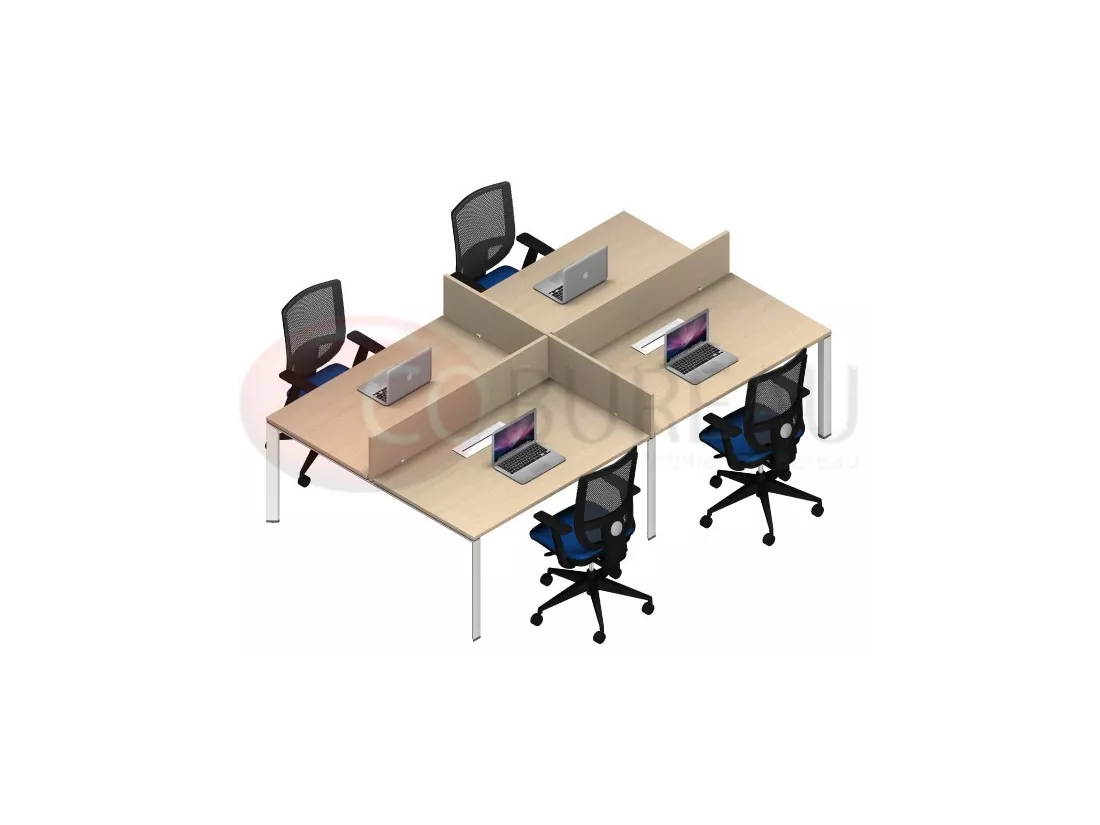 Bench de 4 postes 120 x 80 cm assemblés face à face, équipée de 2 Kits de connexion intégrés aux plateaux, cloisons de séparation en panneau de particules revêtement mélaminé antireflets, épaisseur 19 mm.