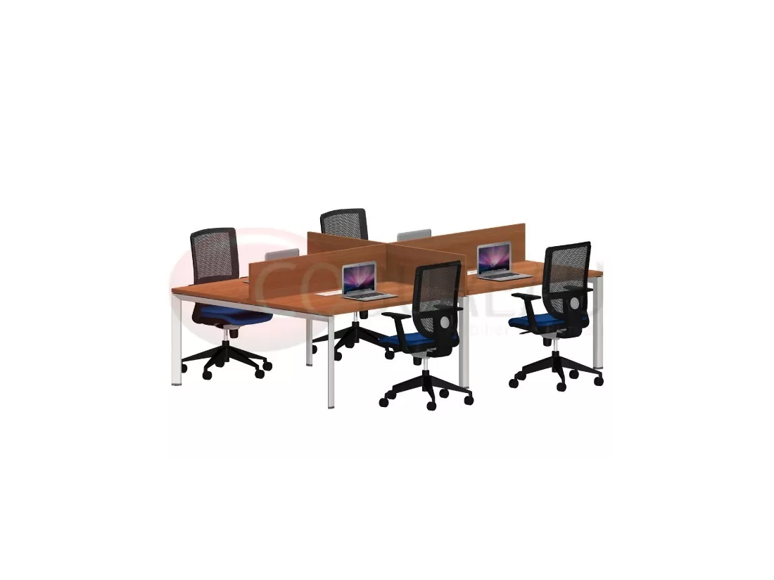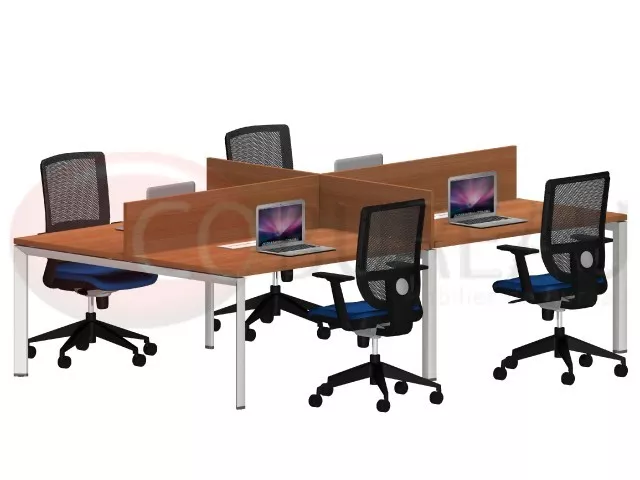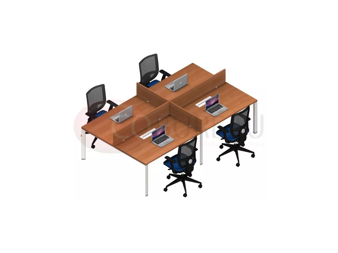 Bench de 4 postes 120 x 80 cm assemblés face à face, équipée de 2 Kits de connexion intégrés aux plateaux, cloisons de séparation en panneau de particules revêtement mélaminé antireflets, épaisseur 19 mm.
