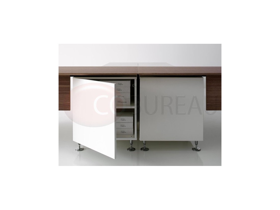 Armoires en mélaminé corps et dos ép. 18mm, tablettes ép. 25mm, top et côtés de finition en stratifié ép. 20mm