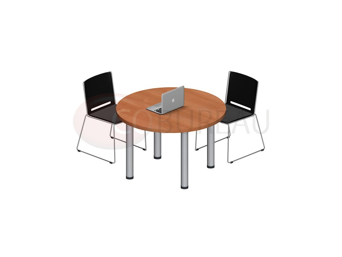 Plateau panneau de particules mélaminés antireflet épaisseur 30 mm; Chant droit ABS antichoc épaisseur 3 mm. 4 pieds tube métal finition aluminium. H 73 cm. Diamètre 100 cm : jusqu'à 5 personnes.